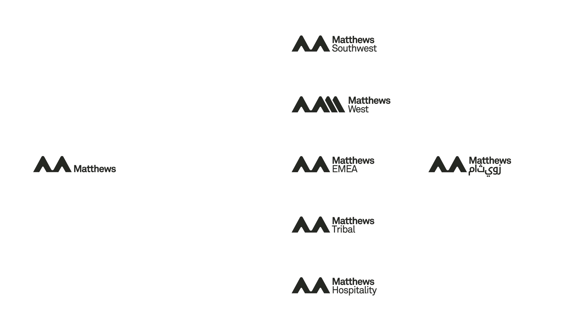 The simplicity of the new name has a ripple effect. That decision led to a simplified and flexible visual identity, establishing clear rules for each division of Matthews. And assigning each entity a bold color allows for individual expression and ownability.