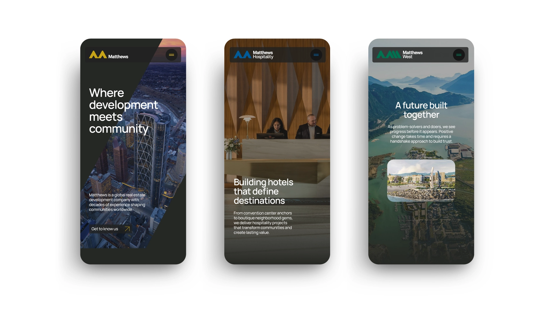 When we first started working with Matthews, one of their biggest challenges was communicating their breadth and depth simply. When you have a global real estate development company with hundreds of team members working on different types of projects, it’s a lot for an outsider to process. After spending months tweaking their brand to help clarify and differentiate their position in a crowded industry, we shifted to apply that clarity directly to their new website.